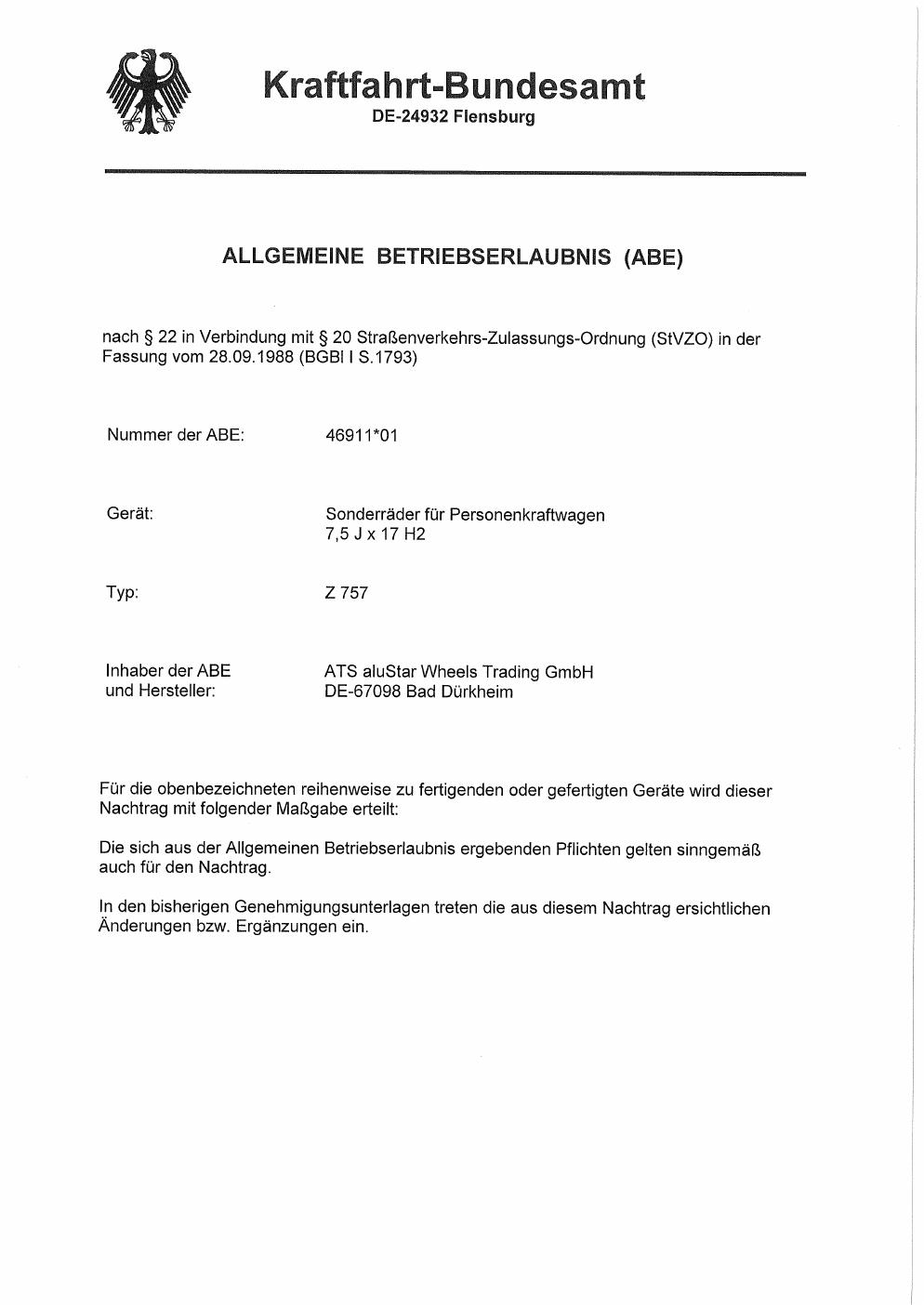 Dieses Gutachten (abe) bezieht sich auf die Alufelge ATS Z 757 in der Ausführung 7.5Jx17 ET 0, Mittenloch 0 mm (KBA 46911). Im PDF findest du typischerweise zulässige Reifengrößen, Auflagen/Anbauhinweise und – je nach Dokument – Hinweise zur Eintragung.