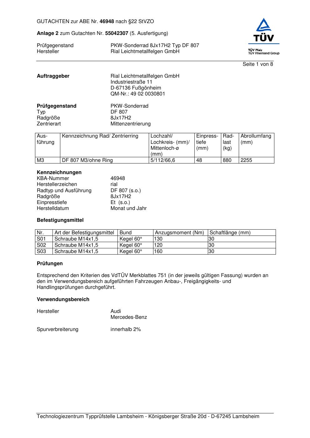 Dieses Gutachten (abe) bezieht sich auf die Alufelge Rial DF 807 in der Ausführung 8Jx17 ET 0, Mittenloch 0 mm (KBA 46948). Im PDF findest du typischerweise zulässige Reifengrößen, Auflagen/Anbauhinweise und – je nach Dokument – Hinweise zur Eintragung.