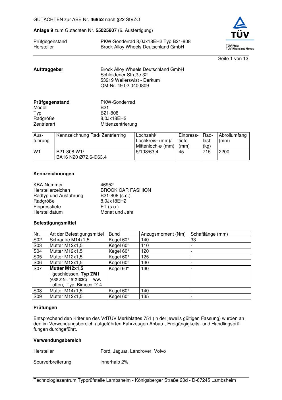 Dieses Gutachten (abe) bezieht sich auf die Alufelge Brock B21-808 in der Ausführung 8Jx18 ET 0, Mittenloch 0 mm (KBA 46952). Im PDF findest du typischerweise zulässige Reifengrößen, Auflagen/Anbauhinweise und – je nach Dokument – Hinweise zur Eintragung.