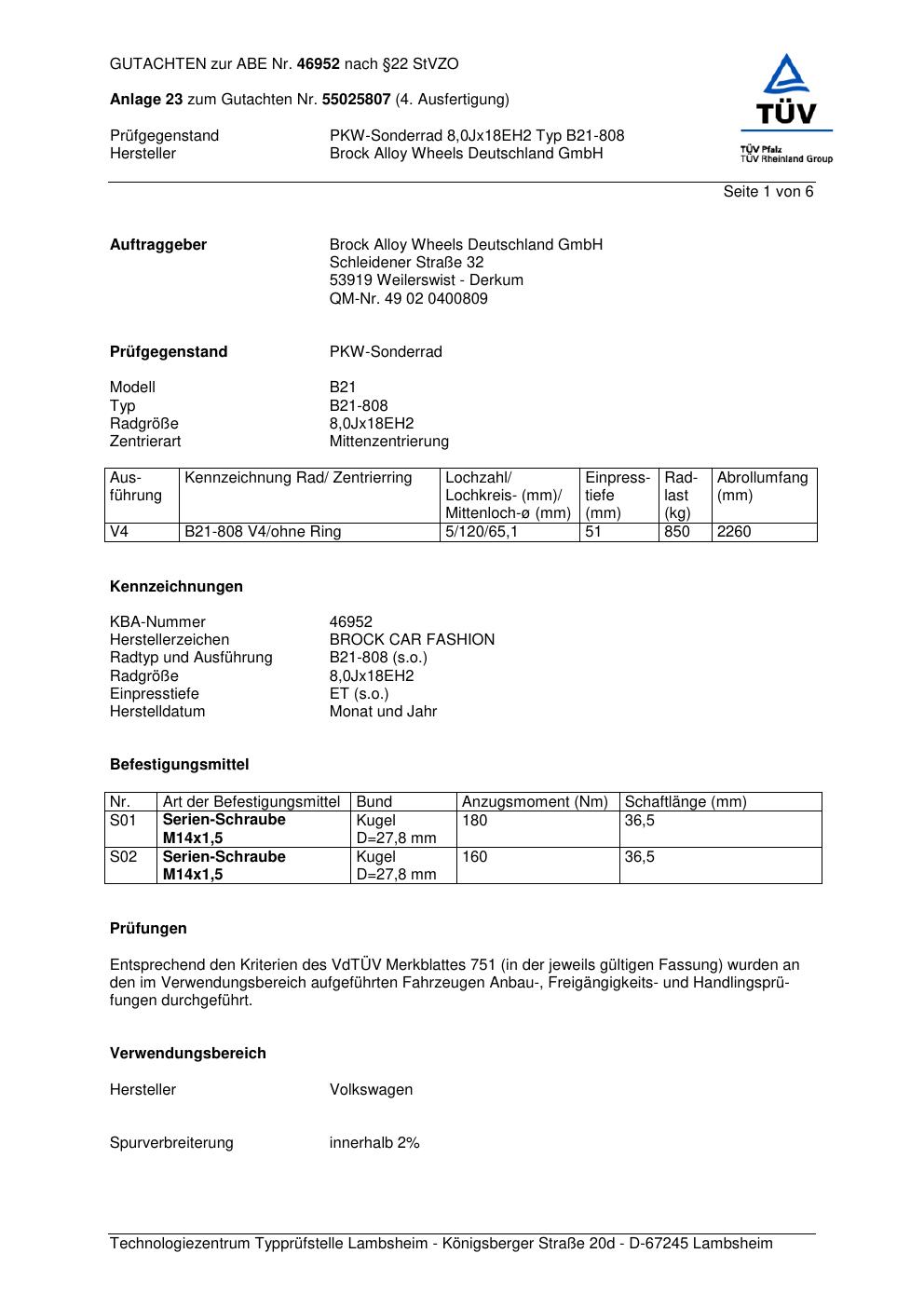 Dieses Gutachten (abe) bezieht sich auf die Alufelge Brock B21-808 in der Ausführung ET 0, Mittenloch 0 mm (KBA 46952). Im PDF findest du typischerweise zulässige Reifengrößen, Auflagen/Anbauhinweise und – je nach Dokument – Hinweise zur Eintragung.