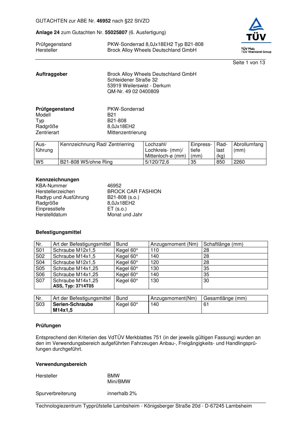 Dieses Gutachten (abe) bezieht sich auf die Alufelge Brock B21-808 in der Ausführung ET 0, Mittenloch 0 mm (KBA 46952). Im PDF findest du typischerweise zulässige Reifengrößen, Auflagen/Anbauhinweise und – je nach Dokument – Hinweise zur Eintragung.