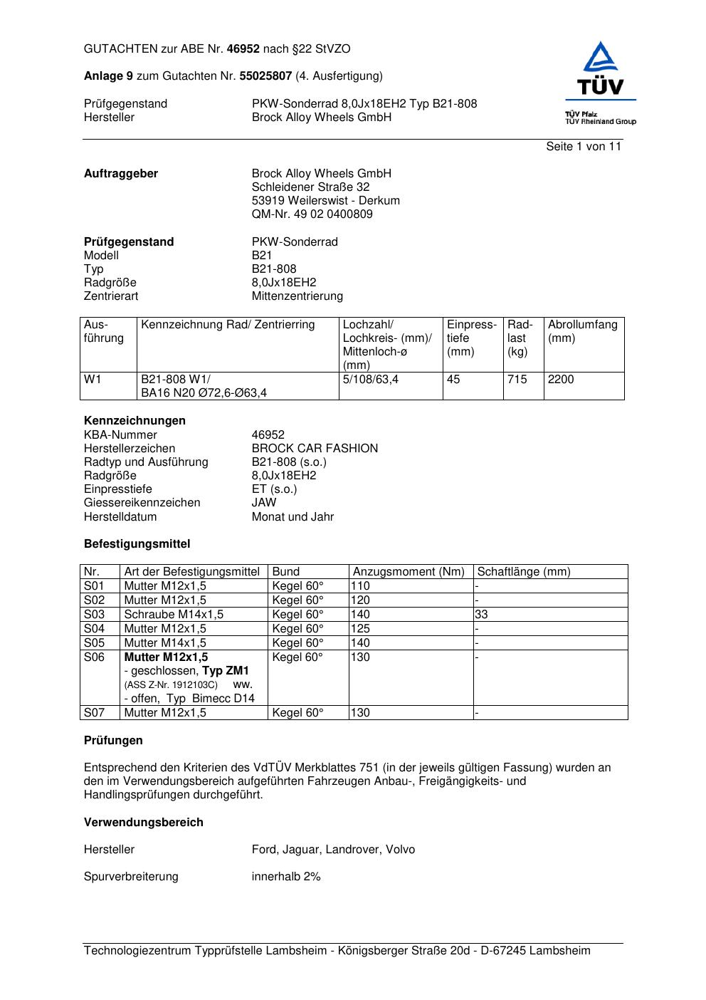 Dieses Gutachten (abe) bezieht sich auf die Alufelge Brock B21-808 in der Ausführung ET 0, Mittenloch 0 mm (KBA 46952). Im PDF findest du typischerweise zulässige Reifengrößen, Auflagen/Anbauhinweise und – je nach Dokument – Hinweise zur Eintragung.