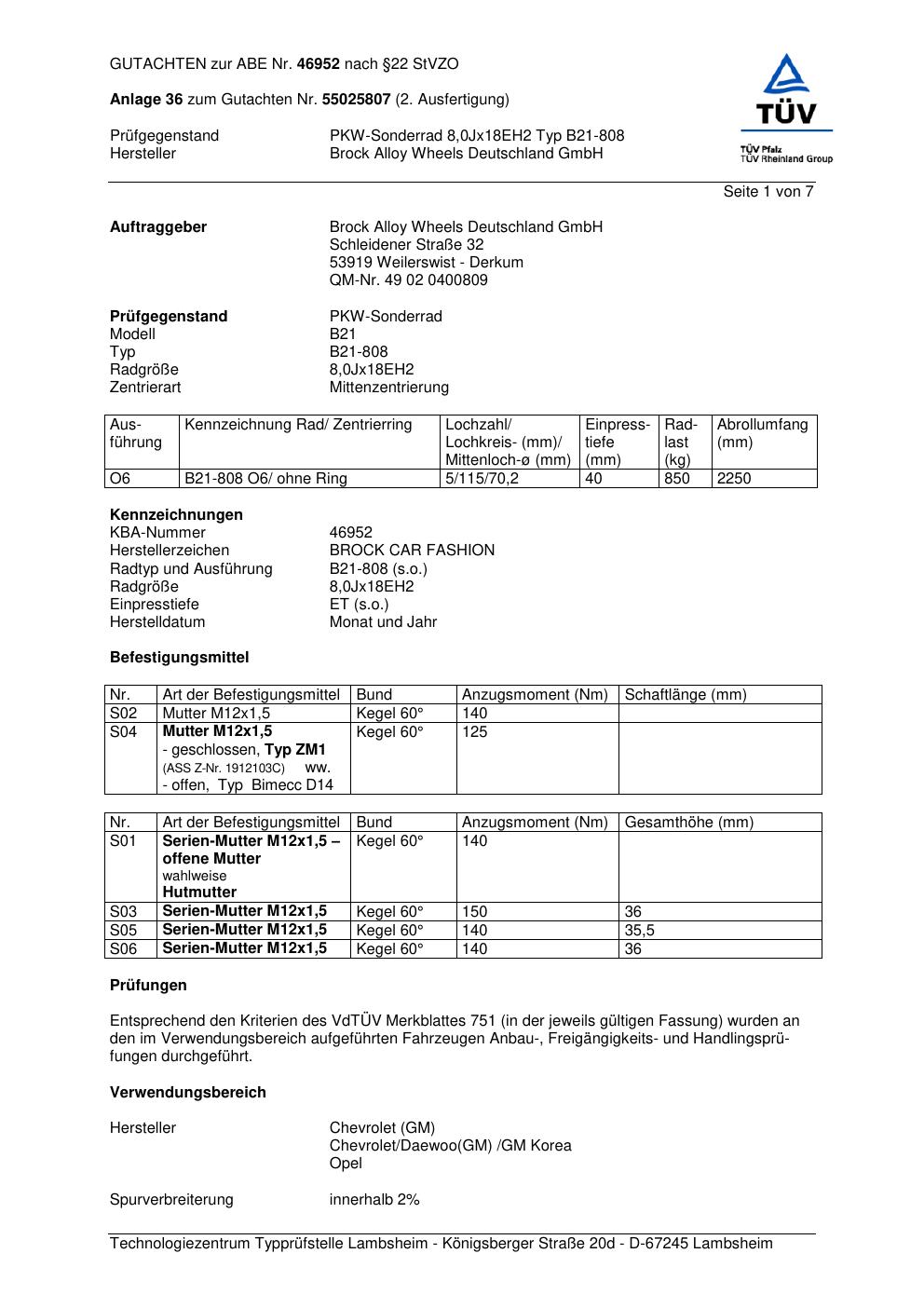 Dieses Gutachten (abe) bezieht sich auf die Alufelge Brock B21-808 in der Ausführung ET 0, Mittenloch 0 mm (KBA 46952). Im PDF findest du typischerweise zulässige Reifengrößen, Auflagen/Anbauhinweise und – je nach Dokument – Hinweise zur Eintragung.