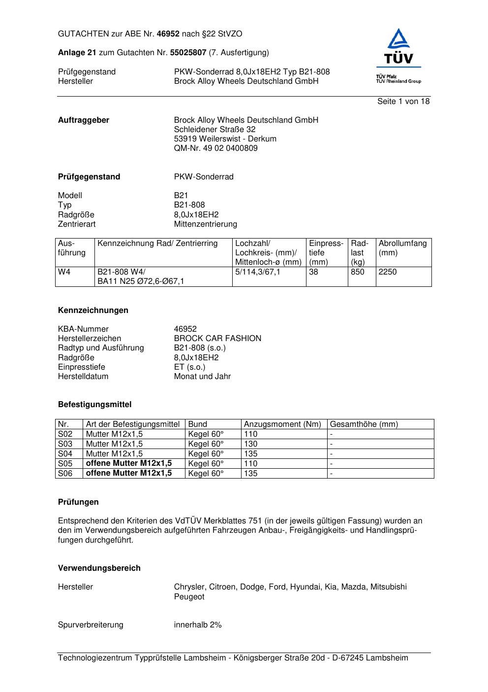 Dieses Gutachten (abe) bezieht sich auf die Alufelge Brock B21-808 in der Ausführung 8Jx18 ET 0, Mittenloch 0 mm (KBA 46952). Im PDF findest du typischerweise zulässige Reifengrößen, Auflagen/Anbauhinweise und – je nach Dokument – Hinweise zur Eintragung.