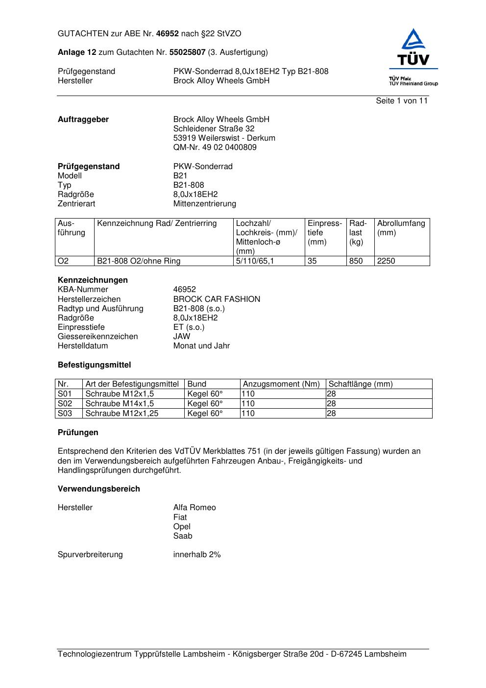 Dieses Gutachten (abe) bezieht sich auf die Alufelge Brock B21-808 in der Ausführung ET 0, Mittenloch 0 mm (KBA 46952). Im PDF findest du typischerweise zulässige Reifengrößen, Auflagen/Anbauhinweise und – je nach Dokument – Hinweise zur Eintragung.