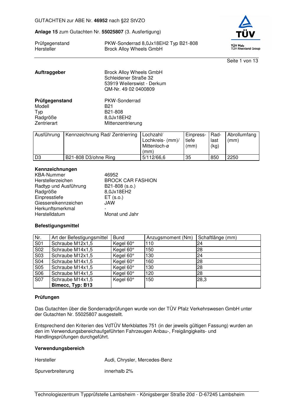 Dieses Gutachten (abe) bezieht sich auf die Alufelge Brock B21-808 in der Ausführung ET 0, Mittenloch 0 mm (KBA 46952). Im PDF findest du typischerweise zulässige Reifengrößen, Auflagen/Anbauhinweise und – je nach Dokument – Hinweise zur Eintragung.
