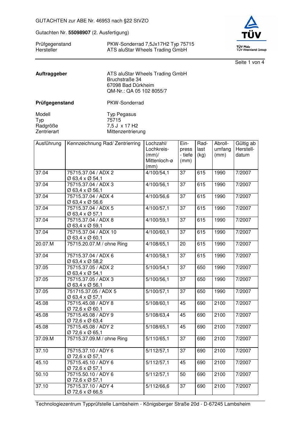 Dieses Gutachten (abe) bezieht sich auf die Alufelge ATS 75715 in der Ausführung 7.5Jx17 ET 0, Mittenloch 0 mm (KBA 46953). Im PDF findest du typischerweise zulässige Reifengrößen, Auflagen/Anbauhinweise und – je nach Dokument – Hinweise zur Eintragung.