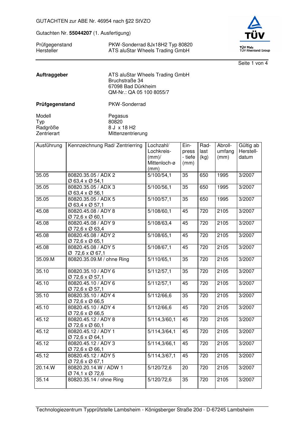 Dieses Gutachten (abe) bezieht sich auf die Alufelge ATS 80820 in der Ausführung 8Jx18 ET 0, Mittenloch 0 mm (KBA 46954). Im PDF findest du typischerweise zulässige Reifengrößen, Auflagen/Anbauhinweise und – je nach Dokument – Hinweise zur Eintragung.