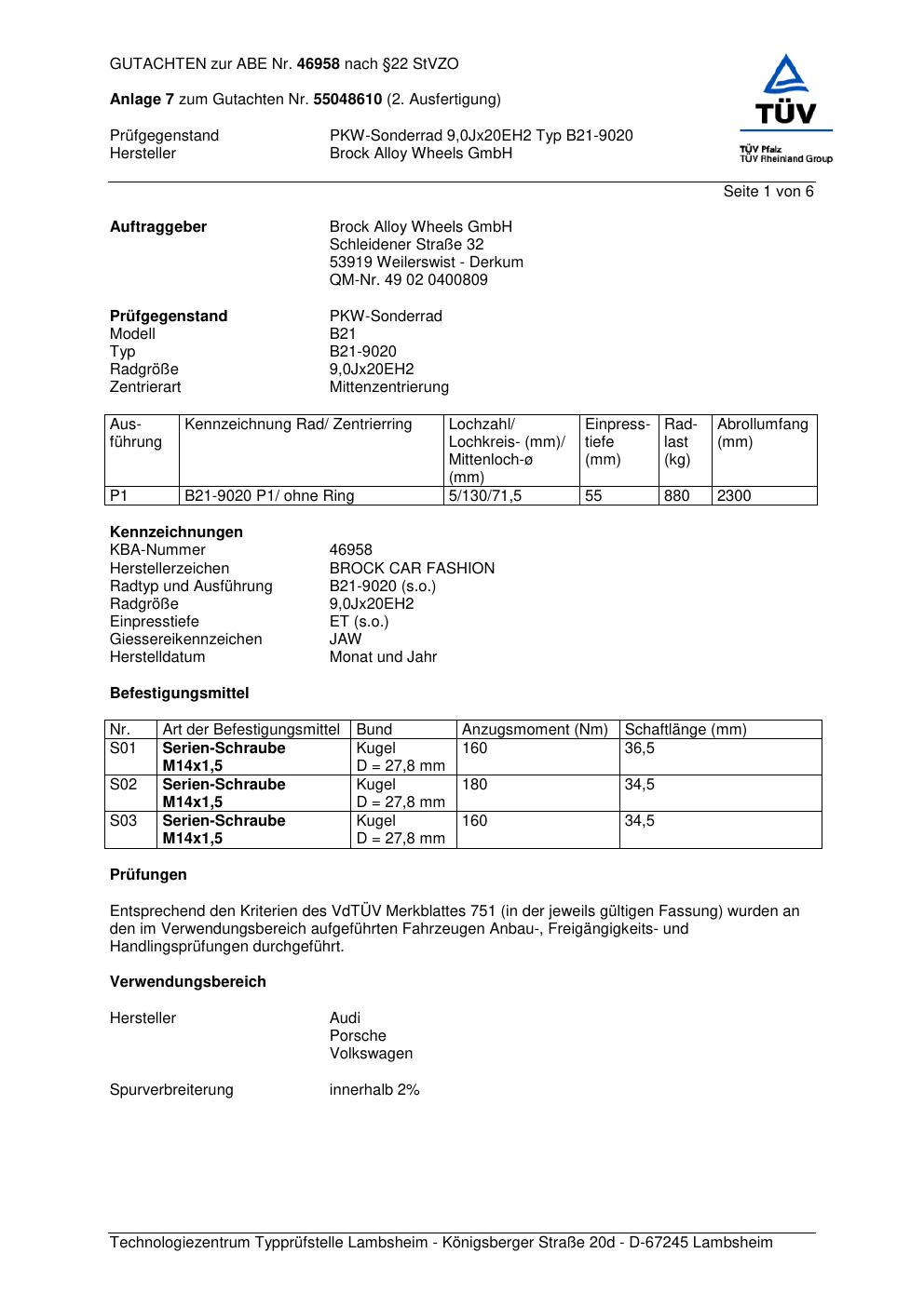 Dieses Gutachten (abe) bezieht sich auf die Alufelge Brock B21-902 0 in der Ausführung ET 0, Mittenloch 0 mm (KBA 46958). Im PDF findest du typischerweise zulässige Reifengrößen, Auflagen/Anbauhinweise und – je nach Dokument – Hinweise zur Eintragung.