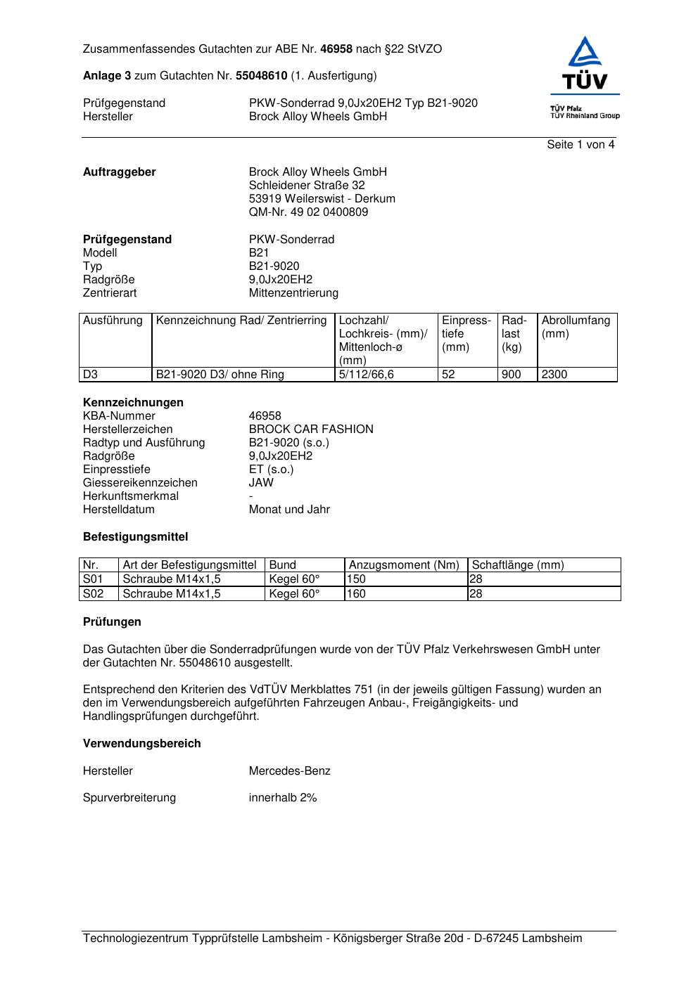 Dieses Gutachten (abe) bezieht sich auf die Alufelge Brock B21-902 0 in der Ausführung ET 0, Mittenloch 0 mm (KBA 46958). Im PDF findest du typischerweise zulässige Reifengrößen, Auflagen/Anbauhinweise und – je nach Dokument – Hinweise zur Eintragung.