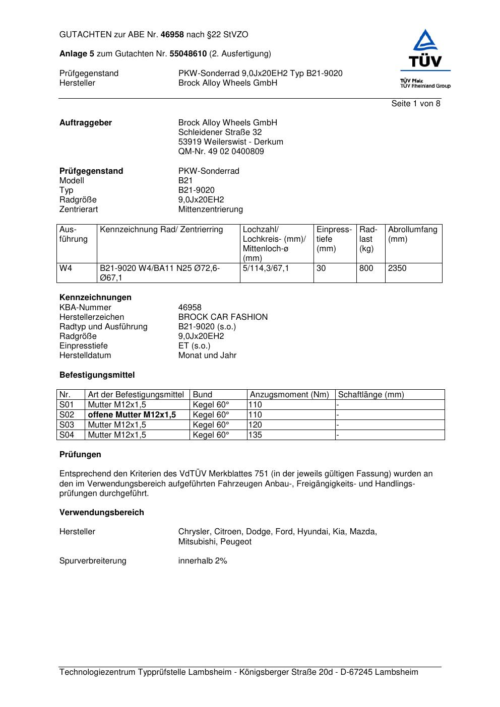 Dieses Gutachten (abe) bezieht sich auf die Alufelge Brock B21-902 0 in der Ausführung ET 0, Mittenloch 0 mm (KBA 46958). Im PDF findest du typischerweise zulässige Reifengrößen, Auflagen/Anbauhinweise und – je nach Dokument – Hinweise zur Eintragung.