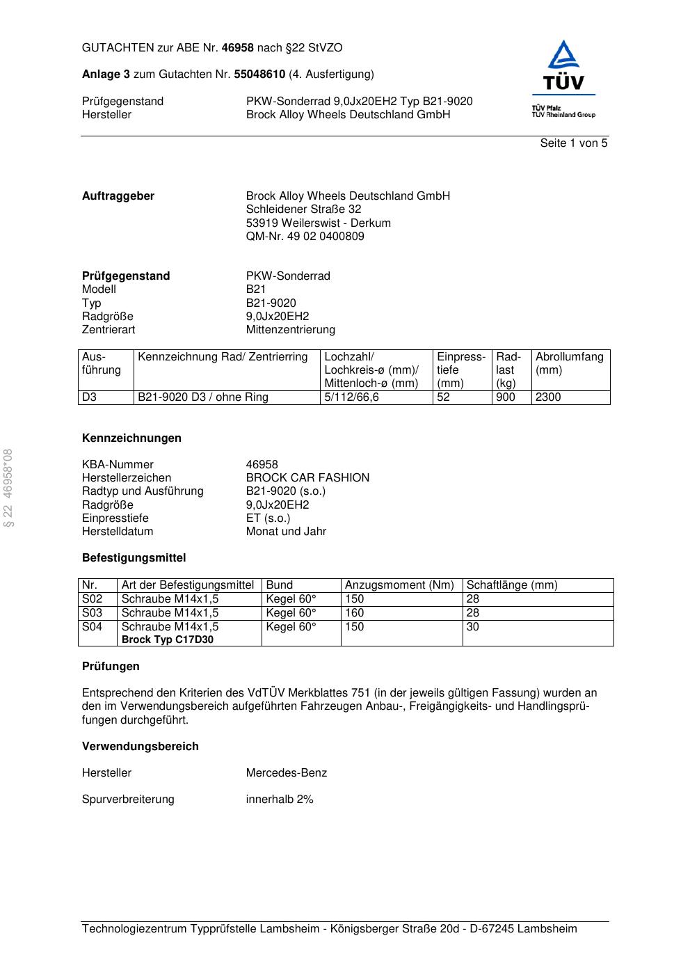 Dieses Gutachten (abe) bezieht sich auf die Alufelge Brock B21-902 0 in der Ausführung ET 0, Mittenloch 0 mm (KBA 46958). Im PDF findest du typischerweise zulässige Reifengrößen, Auflagen/Anbauhinweise und – je nach Dokument – Hinweise zur Eintragung.