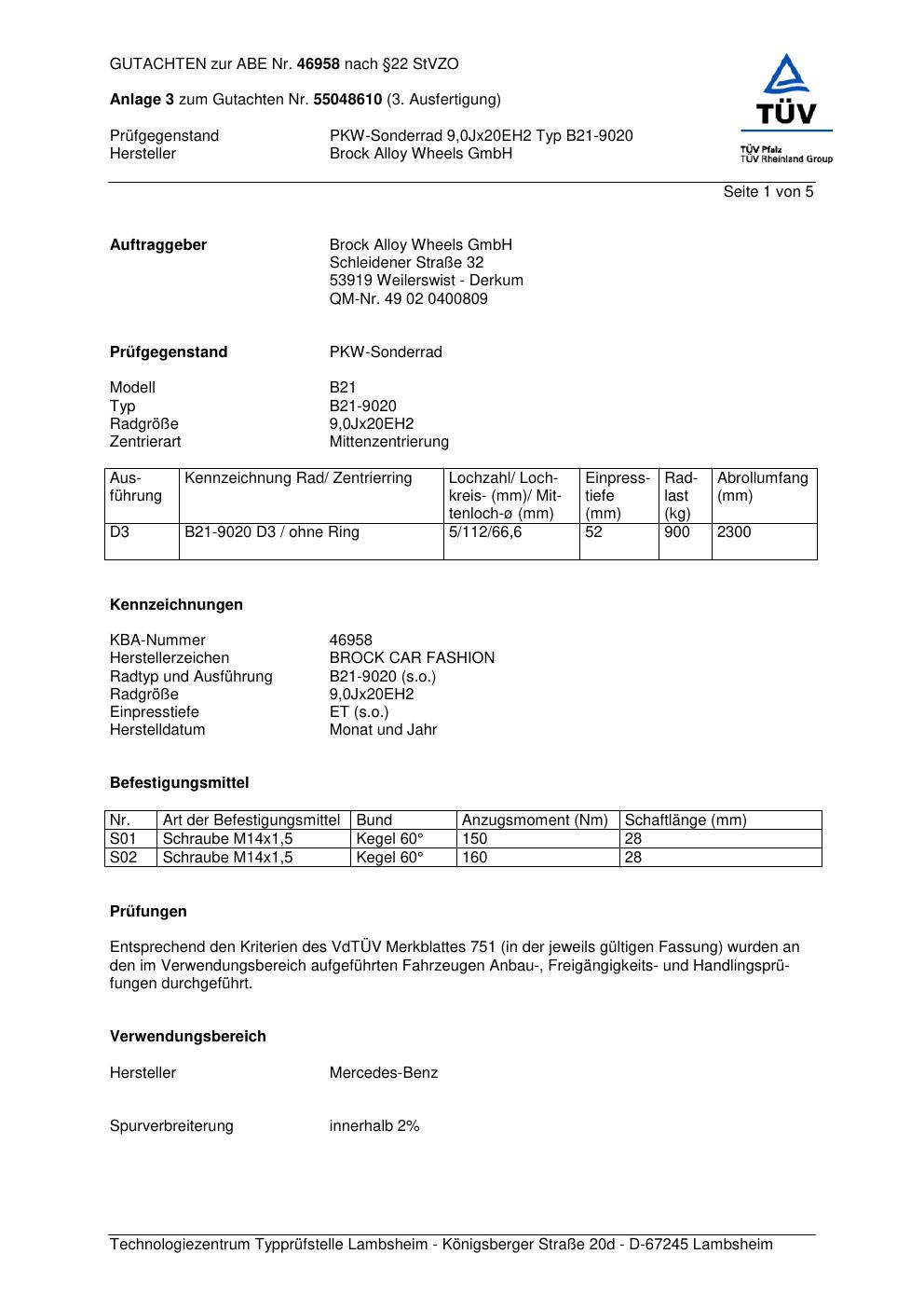 Dieses Gutachten (abe) bezieht sich auf die Alufelge Brock B21-902 0 in der Ausführung ET 0, Mittenloch 0 mm (KBA 46958). Im PDF findest du typischerweise zulässige Reifengrößen, Auflagen/Anbauhinweise und – je nach Dokument – Hinweise zur Eintragung.
