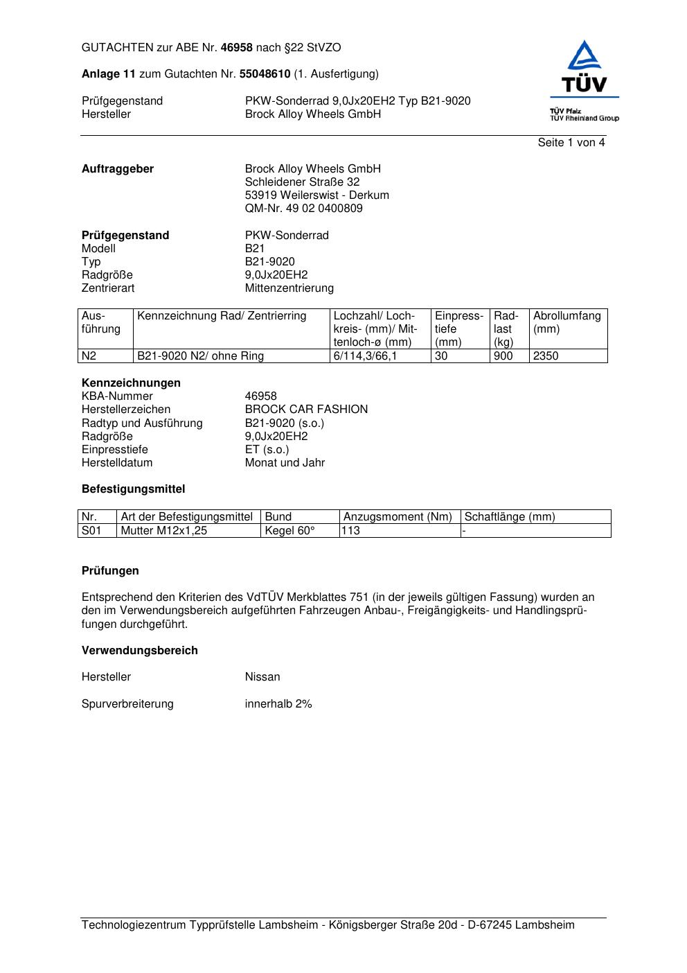 Dieses Gutachten (abe) bezieht sich auf die Alufelge Brock B21-902 0 in der Ausführung ET 0, Mittenloch 0 mm (KBA 46958). Im PDF findest du typischerweise zulässige Reifengrößen, Auflagen/Anbauhinweise und – je nach Dokument – Hinweise zur Eintragung.