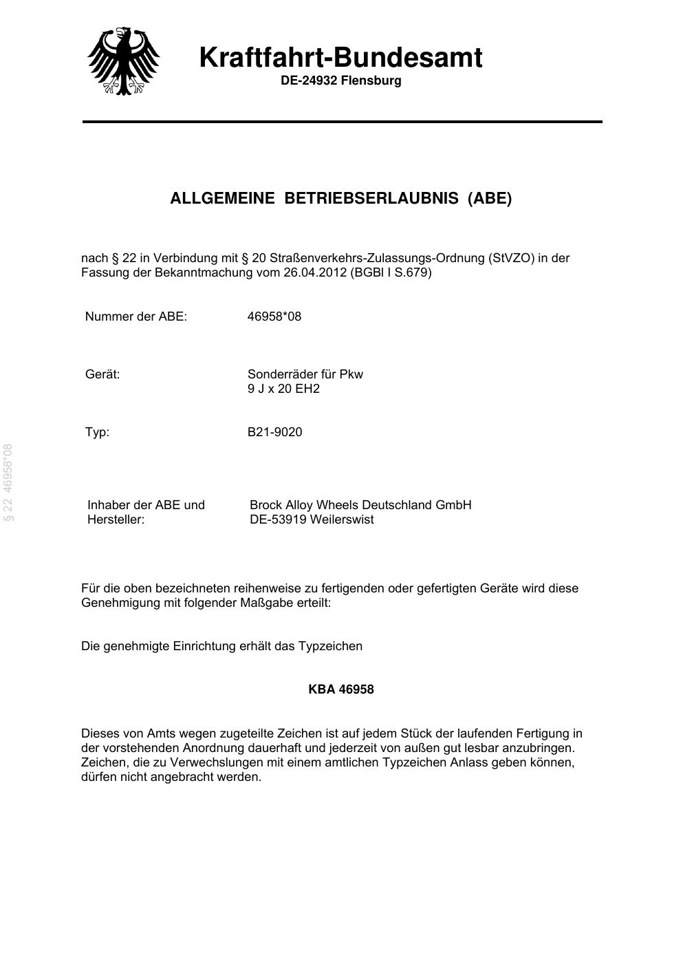 Felgengutachten / abe für Alufelgen Brock B21-9020 (9Jx2 ET 0, Mittenloch 0 mm) mit KBA 46958 (Zertifikatsnummer 46958). Hier kostenlos als PDF herunterladen. Der Download-Link ist 24 Stunden gültig und kann bis zu zwei Mal verwendet werden.