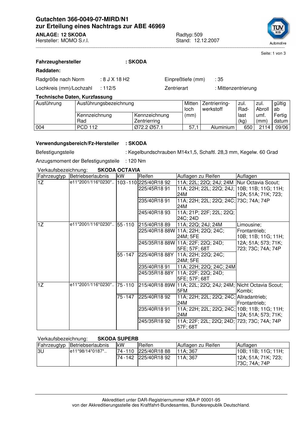 Dieses Gutachten (abe) bezieht sich auf die Alufelge brand-momo 509 in der Ausführung 8Jx18 ET 0, Mittenloch 0 mm (KBA 46969). Im PDF findest du typischerweise zulässige Reifengrößen, Auflagen/Anbauhinweise und – je nach Dokument – Hinweise zur Eintragung.