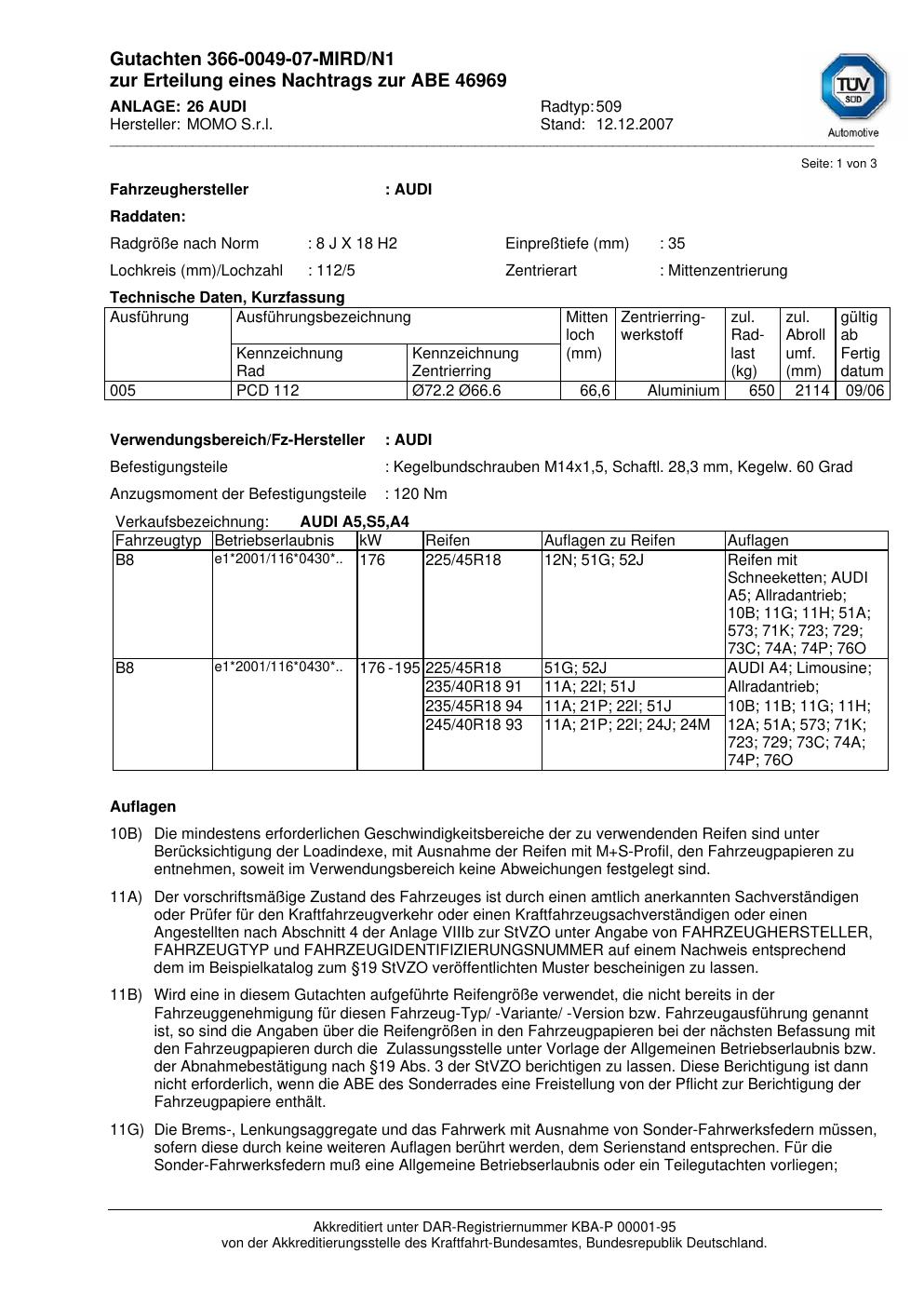Dieses Gutachten (abe) bezieht sich auf die Alufelge brand-momo 509 in der Ausführung 8Jx18 ET 0, Mittenloch 0 mm (KBA 46969). Im PDF findest du typischerweise zulässige Reifengrößen, Auflagen/Anbauhinweise und – je nach Dokument – Hinweise zur Eintragung.
