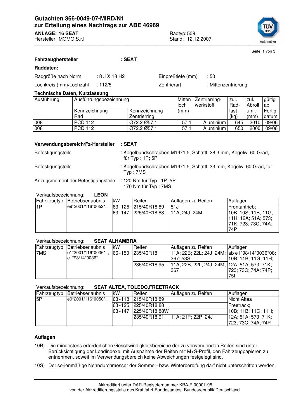 Dieses Gutachten (abe) bezieht sich auf die Alufelge brand-momo 509 in der Ausführung 8Jx18 ET 0, Mittenloch 0 mm (KBA 46969). Im PDF findest du typischerweise zulässige Reifengrößen, Auflagen/Anbauhinweise und – je nach Dokument – Hinweise zur Eintragung.