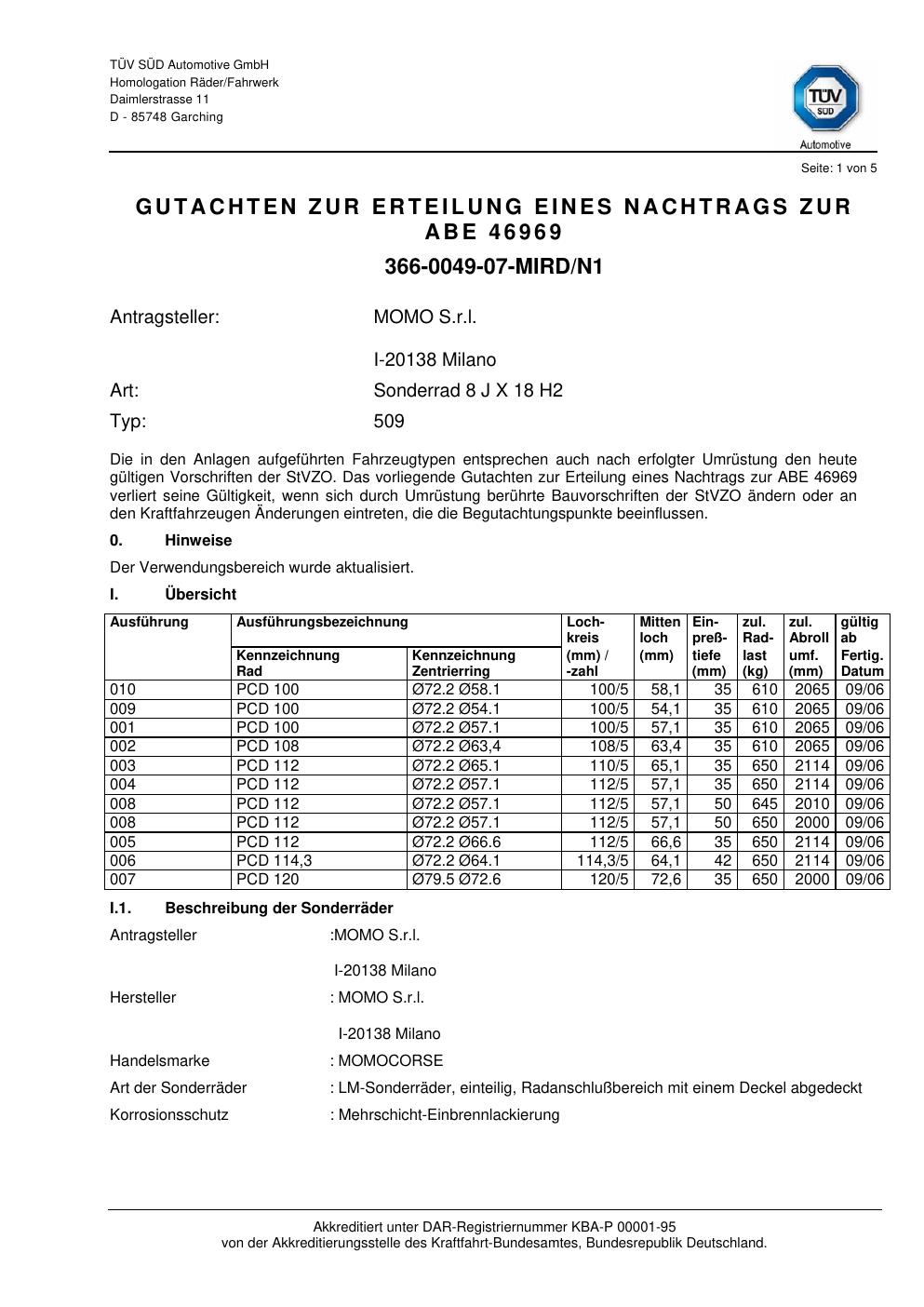 Dieses Gutachten (abe) bezieht sich auf die Alufelge Momo 509 in der Ausführung 8Jx18 ET 0, Mittenloch 0 mm (KBA 46969). Im PDF findest du typischerweise zulässige Reifengrößen, Auflagen/Anbauhinweise und – je nach Dokument – Hinweise zur Eintragung.