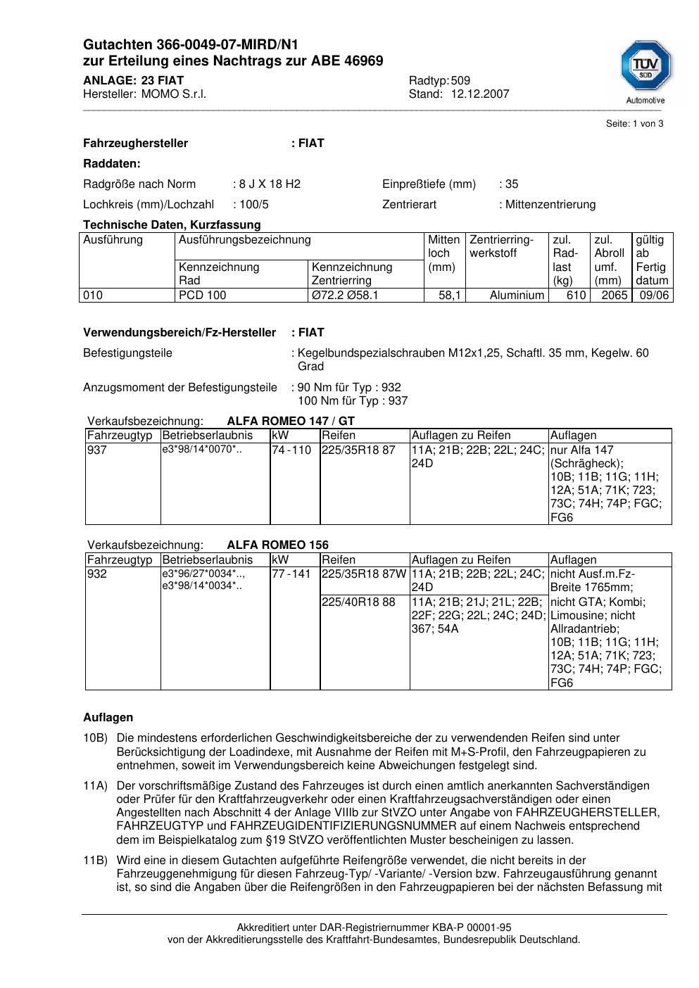Dieses Gutachten (abe) bezieht sich auf die Alufelge brand-momo 509 in der Ausführung 8Jx18 ET 0, Mittenloch 0 mm (KBA 46969). Im PDF findest du typischerweise zulässige Reifengrößen, Auflagen/Anbauhinweise und – je nach Dokument – Hinweise zur Eintragung.