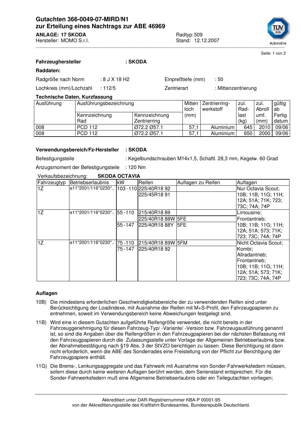 Dieses Gutachten (abe) bezieht sich auf die Alufelge brand-momo 509 in der Ausführung 8Jx18 ET 0, Mittenloch 0 mm (KBA 46969). Im PDF findest du typischerweise zulässige Reifengrößen, Auflagen/Anbauhinweise und – je nach Dokument – Hinweise zur Eintragung.
