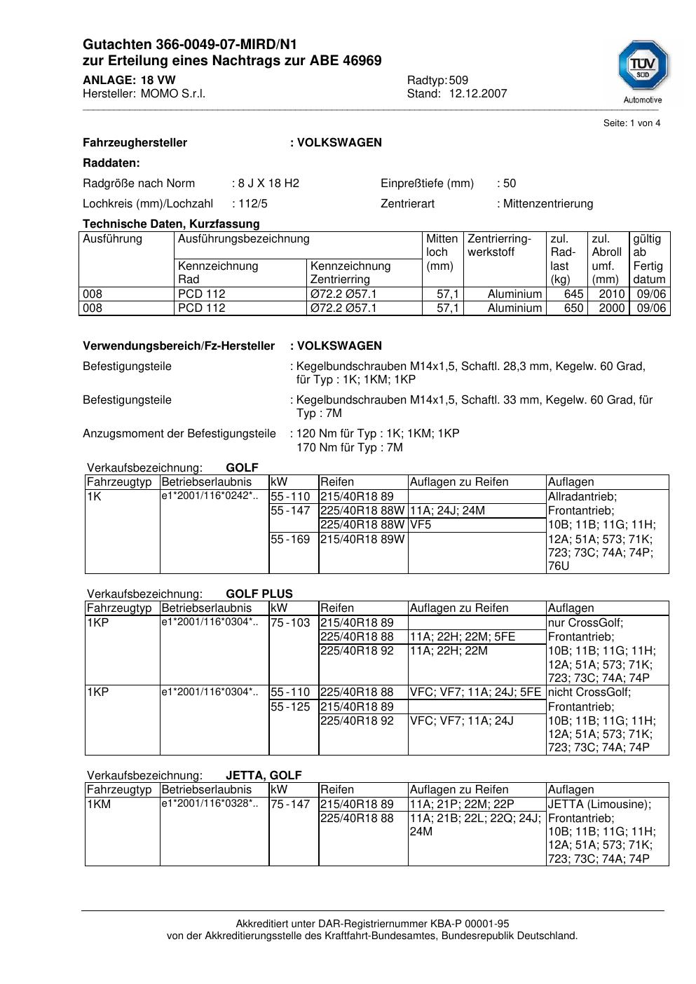 Dieses Gutachten (abe) bezieht sich auf die Alufelge brand-momo 509 in der Ausführung 8Jx18 ET 0, Mittenloch 0 mm (KBA 46969). Im PDF findest du typischerweise zulässige Reifengrößen, Auflagen/Anbauhinweise und – je nach Dokument – Hinweise zur Eintragung.