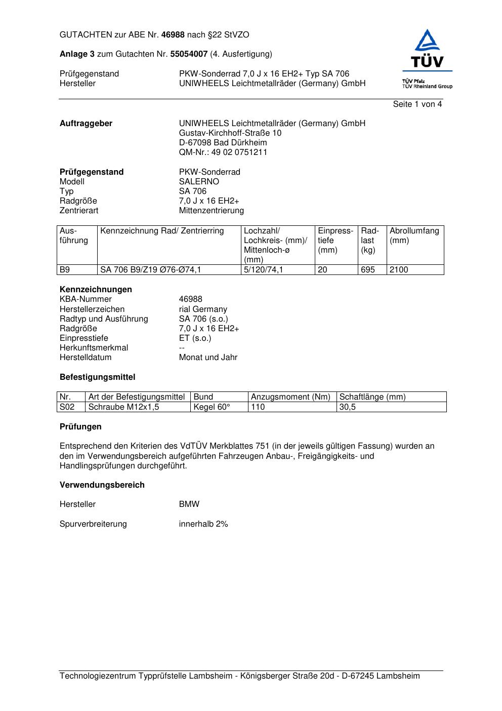 Dieses Gutachten (abe) bezieht sich auf die Alufelge brand-rial SA 706 in der Ausführung 7Jx16 ET 0, Mittenloch 0 mm (KBA 46988). Im PDF findest du typischerweise zulässige Reifengrößen, Auflagen/Anbauhinweise und – je nach Dokument – Hinweise zur Eintragung.
