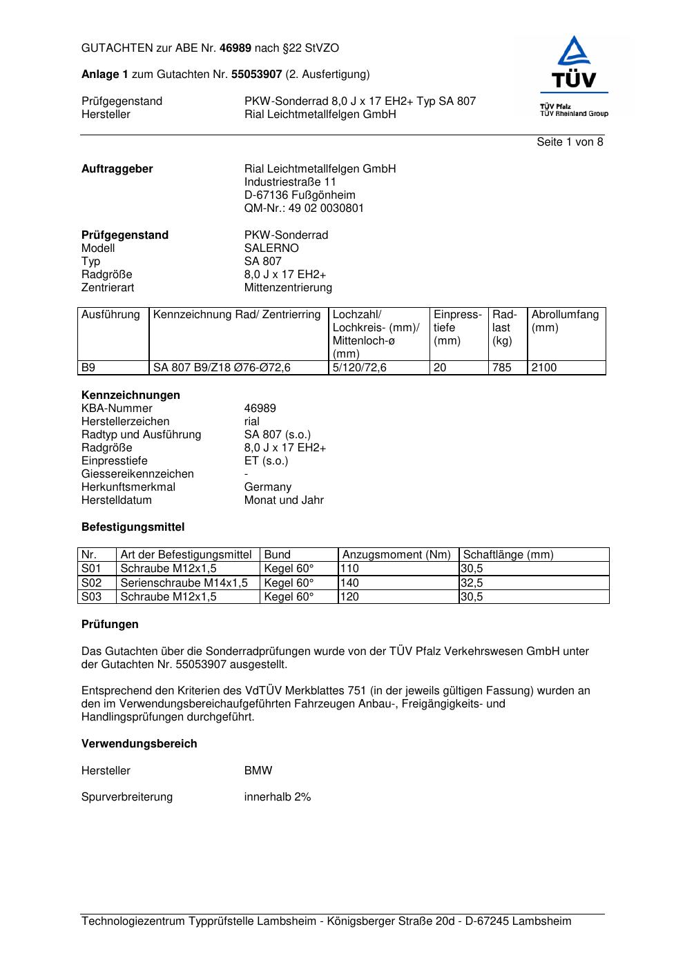 Dieses Gutachten (abe) bezieht sich auf die Alufelge brand-rial SA 807 in der Ausführung 8Jx17 ET 0, Mittenloch 0 mm (KBA 46989). Im PDF findest du typischerweise zulässige Reifengrößen, Auflagen/Anbauhinweise und – je nach Dokument – Hinweise zur Eintragung.