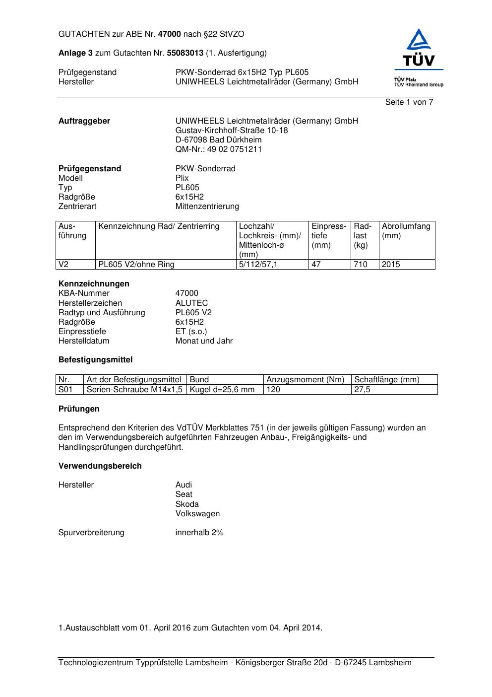 Dieses Gutachten (abe) bezieht sich auf die Alufelge ALUTEC PL605 in der Ausführung 6Jx15 ET 0, Mittenloch 0 mm (KBA 47000). Im PDF findest du typischerweise zulässige Reifengrößen, Auflagen/Anbauhinweise und – je nach Dokument – Hinweise zur Eintragung.