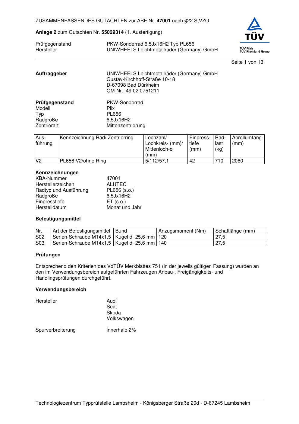 Dieses Gutachten (abe) bezieht sich auf die Alufelge ALUTEC PL656 in der Ausführung 6.5Jx16 ET 0, Mittenloch 0 mm (KBA 47001). Im PDF findest du typischerweise zulässige Reifengrößen, Auflagen/Anbauhinweise und – je nach Dokument – Hinweise zur Eintragung.
