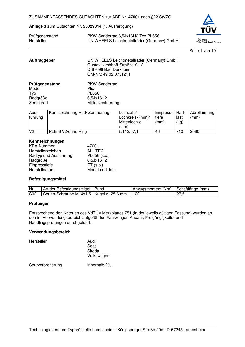 Dieses Gutachten (abe) bezieht sich auf die Alufelge ALUTEC PL656 in der Ausführung 6.5Jx16 ET 0, Mittenloch 0 mm (KBA 47001). Im PDF findest du typischerweise zulässige Reifengrößen, Auflagen/Anbauhinweise und – je nach Dokument – Hinweise zur Eintragung.