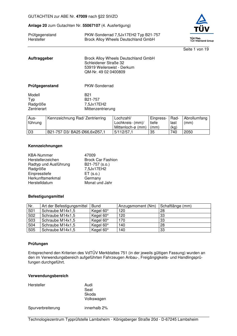 Felgengutachten / abe für Alufelgen Brock B21-757 (70Jx2 ET 0, Mittenloch 0 mm) mit KBA 47009 (Zertifikatsnummer 47009). Hier kostenlos als PDF herunterladen. Der Download-Link ist 24 Stunden gültig und kann bis zu zwei Mal verwendet werden.