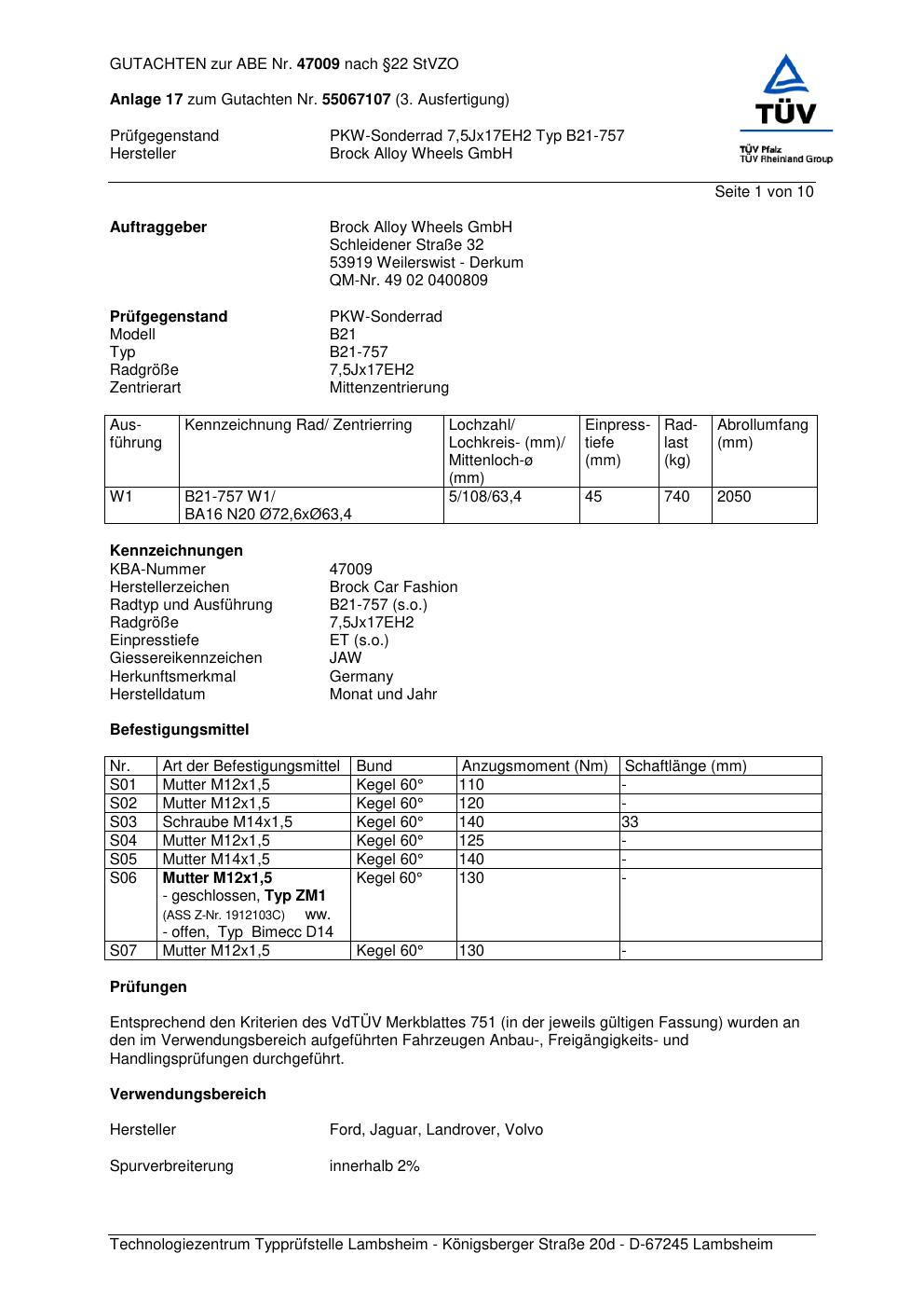 Dieses Gutachten (abe) bezieht sich auf die Alufelge Brock B21-757 in der Ausführung ET 0, Mittenloch 0 mm (KBA 47009). Im PDF findest du typischerweise zulässige Reifengrößen, Auflagen/Anbauhinweise und – je nach Dokument – Hinweise zur Eintragung.