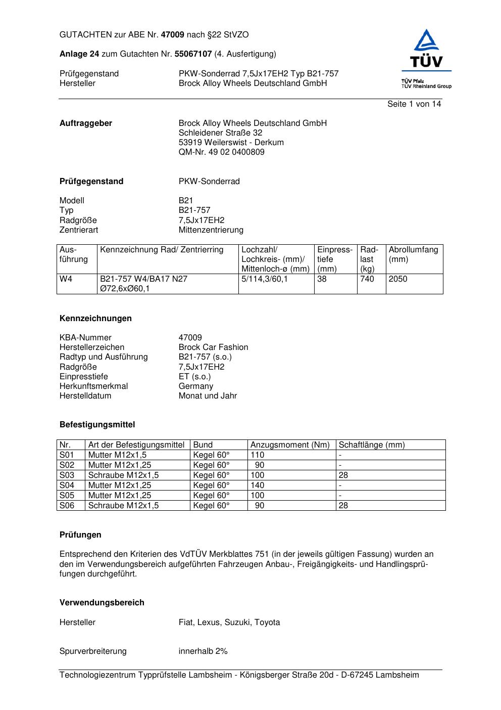 Dieses Gutachten (abe) bezieht sich auf die Alufelge Brock B21-757 in der Ausführung ET 0, Mittenloch 0 mm (KBA 47009). Im PDF findest du typischerweise zulässige Reifengrößen, Auflagen/Anbauhinweise und – je nach Dokument – Hinweise zur Eintragung.