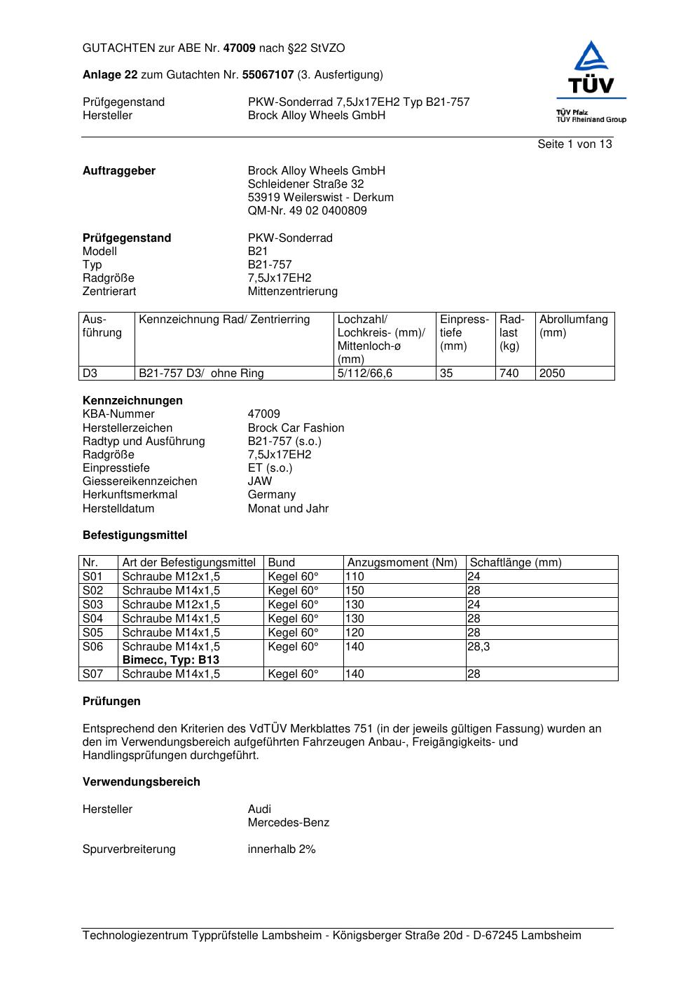 Dieses Gutachten (abe) bezieht sich auf die Alufelge Brock B21-757 in der Ausführung ET 0, Mittenloch 0 mm (KBA 47009). Im PDF findest du typischerweise zulässige Reifengrößen, Auflagen/Anbauhinweise und – je nach Dokument – Hinweise zur Eintragung.