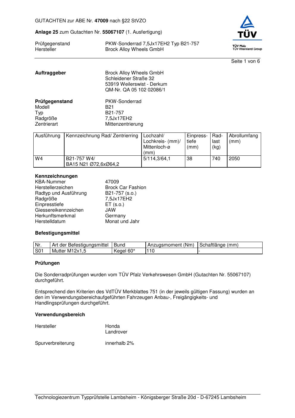 Dieses Gutachten (abe) bezieht sich auf die Alufelge Brock B21-757 in der Ausführung ET 0, Mittenloch 0 mm (KBA 47009). Im PDF findest du typischerweise zulässige Reifengrößen, Auflagen/Anbauhinweise und – je nach Dokument – Hinweise zur Eintragung.