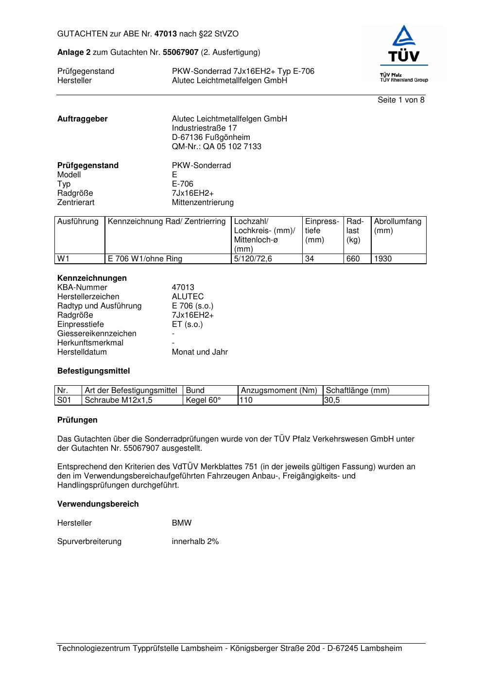 Dieses Gutachten (abe) bezieht sich auf die Alufelge ALUTEC E-706 in der Ausführung ET 0, Mittenloch 0 mm (KBA 47013). Im PDF findest du typischerweise zulässige Reifengrößen, Auflagen/Anbauhinweise und – je nach Dokument – Hinweise zur Eintragung.