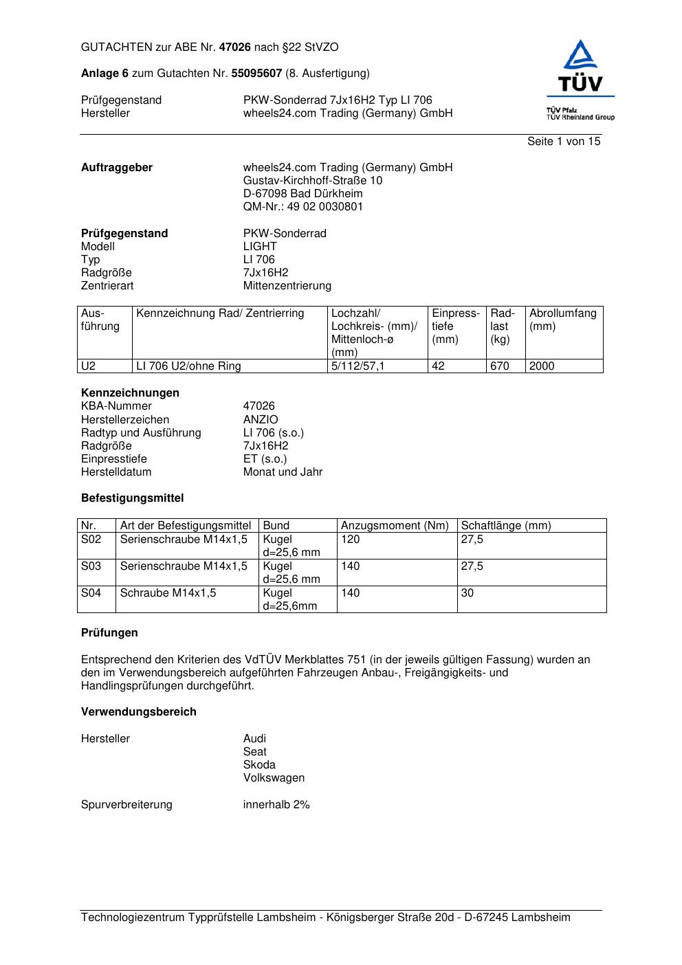 Dieses Gutachten (abe) bezieht sich auf die Alufelge Anzio LI 706 in der Ausführung 7Jx16 ET 0, Mittenloch 0 mm (KBA 47026). Im PDF findest du typischerweise zulässige Reifengrößen, Auflagen/Anbauhinweise und – je nach Dokument – Hinweise zur Eintragung.
