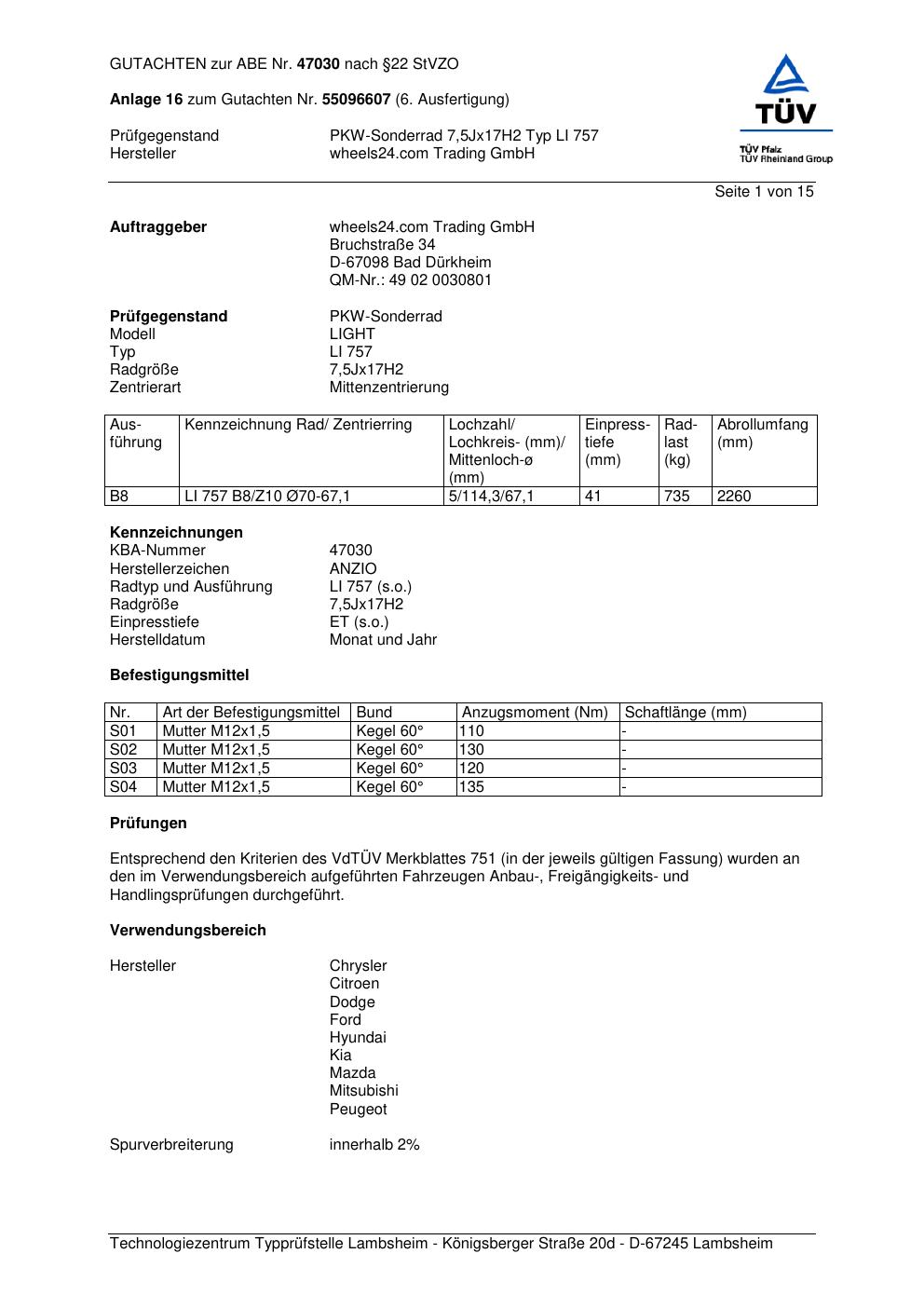 Dieses Gutachten (abe) bezieht sich auf die Alufelge Anzio LI 757 in der Ausführung 7.5Jx17 ET 0, Mittenloch 0 mm (KBA 47030). Im PDF findest du typischerweise zulässige Reifengrößen, Auflagen/Anbauhinweise und – je nach Dokument – Hinweise zur Eintragung.
