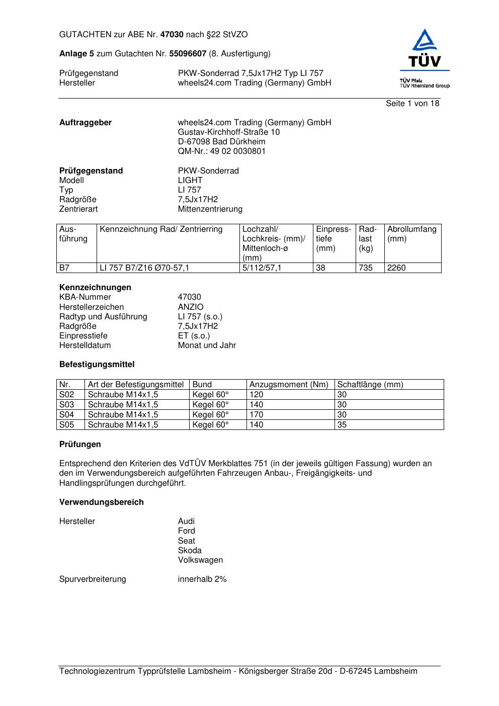 Dieses Gutachten (abe) bezieht sich auf die Alufelge Anzio LI 757 in der Ausführung 7.5Jx17 ET 0, Mittenloch 0 mm (KBA 47030). Im PDF findest du typischerweise zulässige Reifengrößen, Auflagen/Anbauhinweise und – je nach Dokument – Hinweise zur Eintragung.