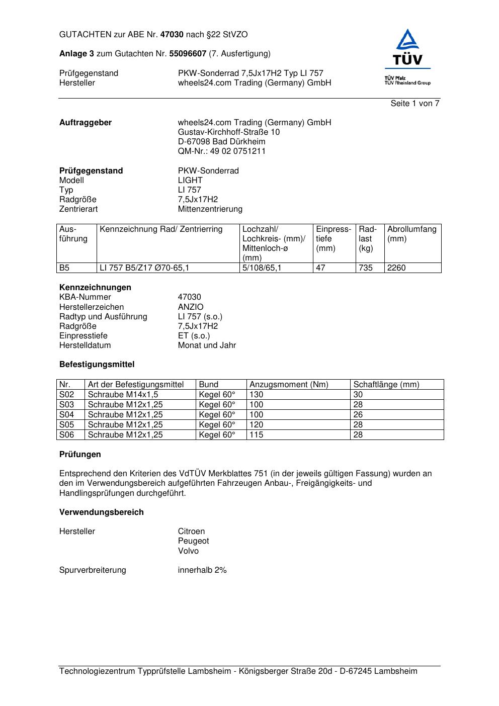 Dieses Gutachten (abe) bezieht sich auf die Alufelge Anzio LI 757 in der Ausführung 7.5Jx17 ET 0, Mittenloch 0 mm (KBA 47030). Im PDF findest du typischerweise zulässige Reifengrößen, Auflagen/Anbauhinweise und – je nach Dokument – Hinweise zur Eintragung.