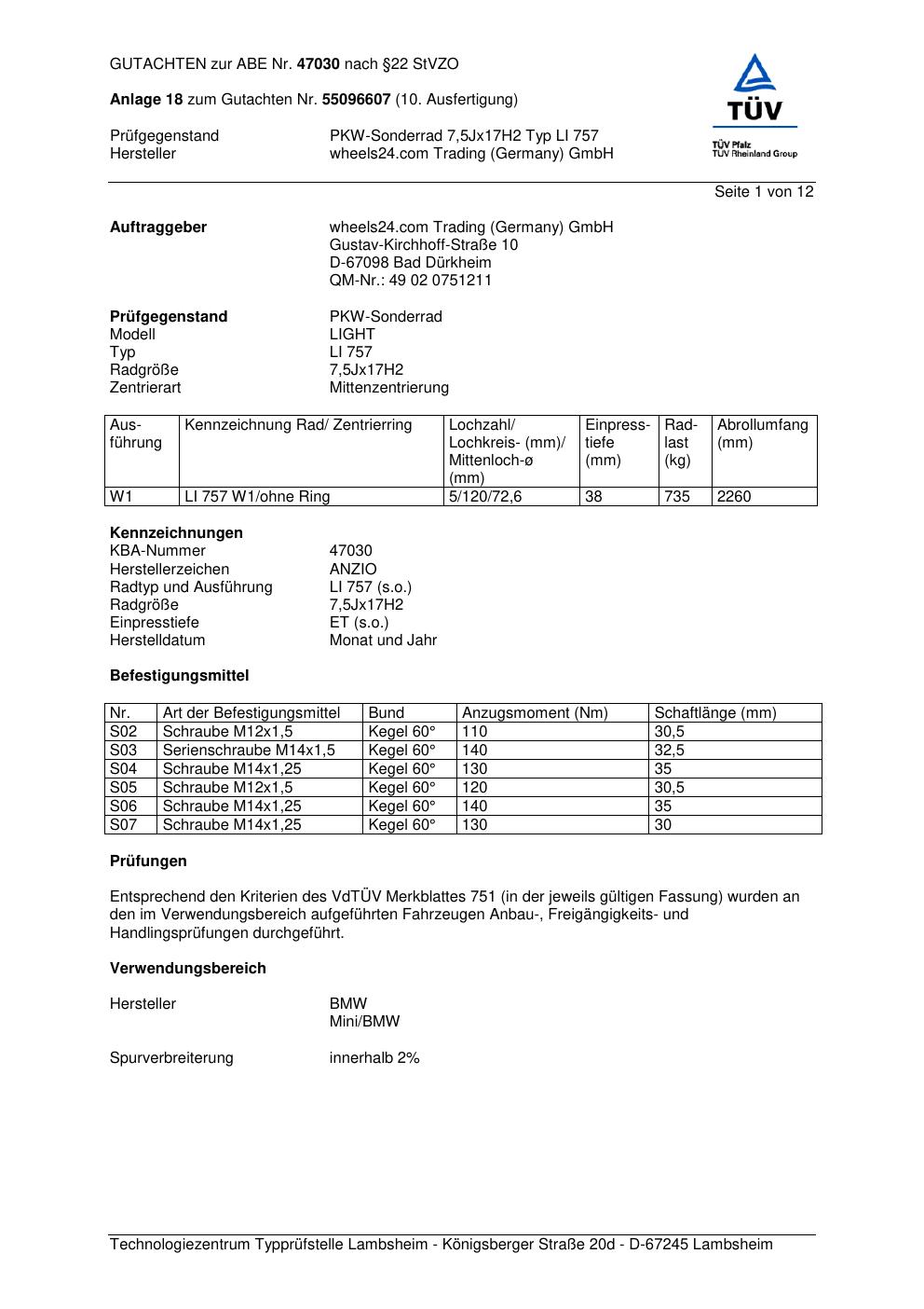 Dieses Gutachten (abe) bezieht sich auf die Alufelge Anzio LI 757 in der Ausführung 7.5Jx17 ET 0, Mittenloch 0 mm (KBA 47030). Im PDF findest du typischerweise zulässige Reifengrößen, Auflagen/Anbauhinweise und – je nach Dokument – Hinweise zur Eintragung.