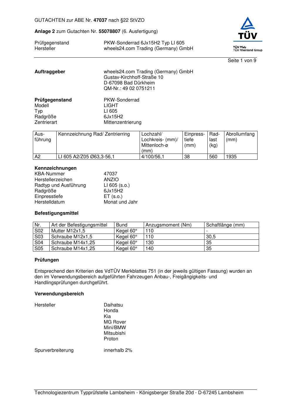 Dieses Gutachten (abe) bezieht sich auf die Alufelge Anzio LI 605 in der Ausführung 6Jx15 ET 0, Mittenloch 0 mm (KBA 47037). Im PDF findest du typischerweise zulässige Reifengrößen, Auflagen/Anbauhinweise und – je nach Dokument – Hinweise zur Eintragung.