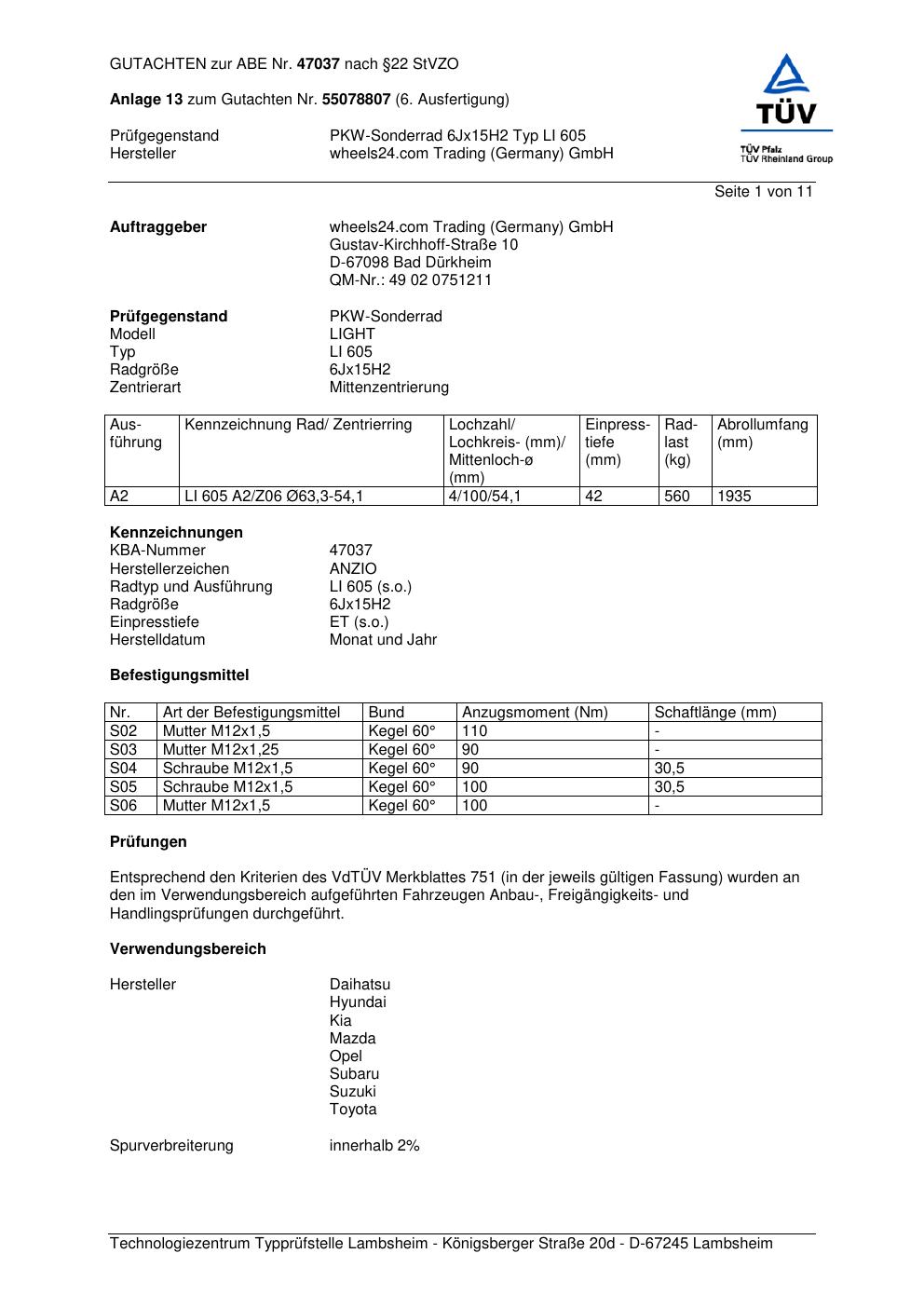 Dieses Gutachten (abe) bezieht sich auf die Alufelge Anzio LI 605 in der Ausführung 6Jx15 ET 0, Mittenloch 0 mm (KBA 47037). Im PDF findest du typischerweise zulässige Reifengrößen, Auflagen/Anbauhinweise und – je nach Dokument – Hinweise zur Eintragung.