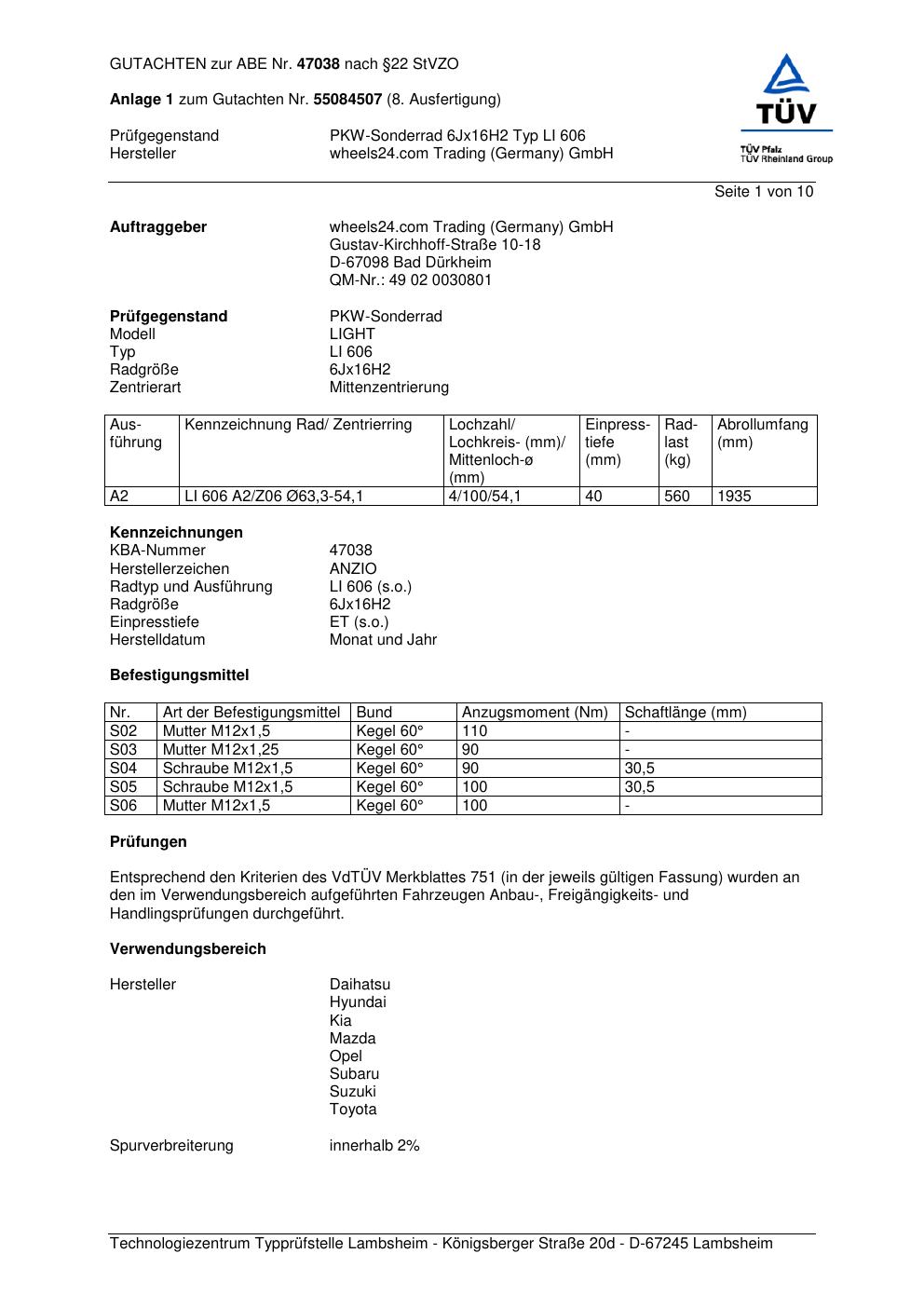 Dieses Gutachten (abe) bezieht sich auf die Alufelge Anzio LI 606 in der Ausführung 6Jx16 ET 0, Mittenloch 0 mm (KBA 47038). Im PDF findest du typischerweise zulässige Reifengrößen, Auflagen/Anbauhinweise und – je nach Dokument – Hinweise zur Eintragung.