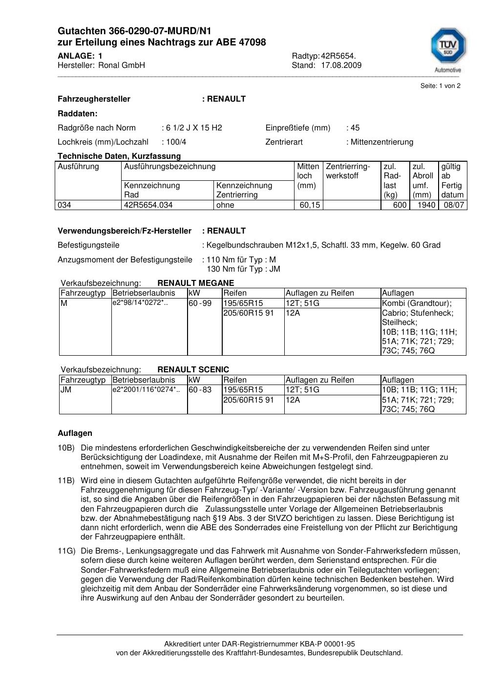 Dieses Gutachten (abe) bezieht sich auf die Alufelge Ronal 42R5654 in der Ausführung 2Jx15 ET 0, Mittenloch 0 mm (KBA 47098). Im PDF findest du typischerweise zulässige Reifengrößen, Auflagen/Anbauhinweise und – je nach Dokument – Hinweise zur Eintragung.