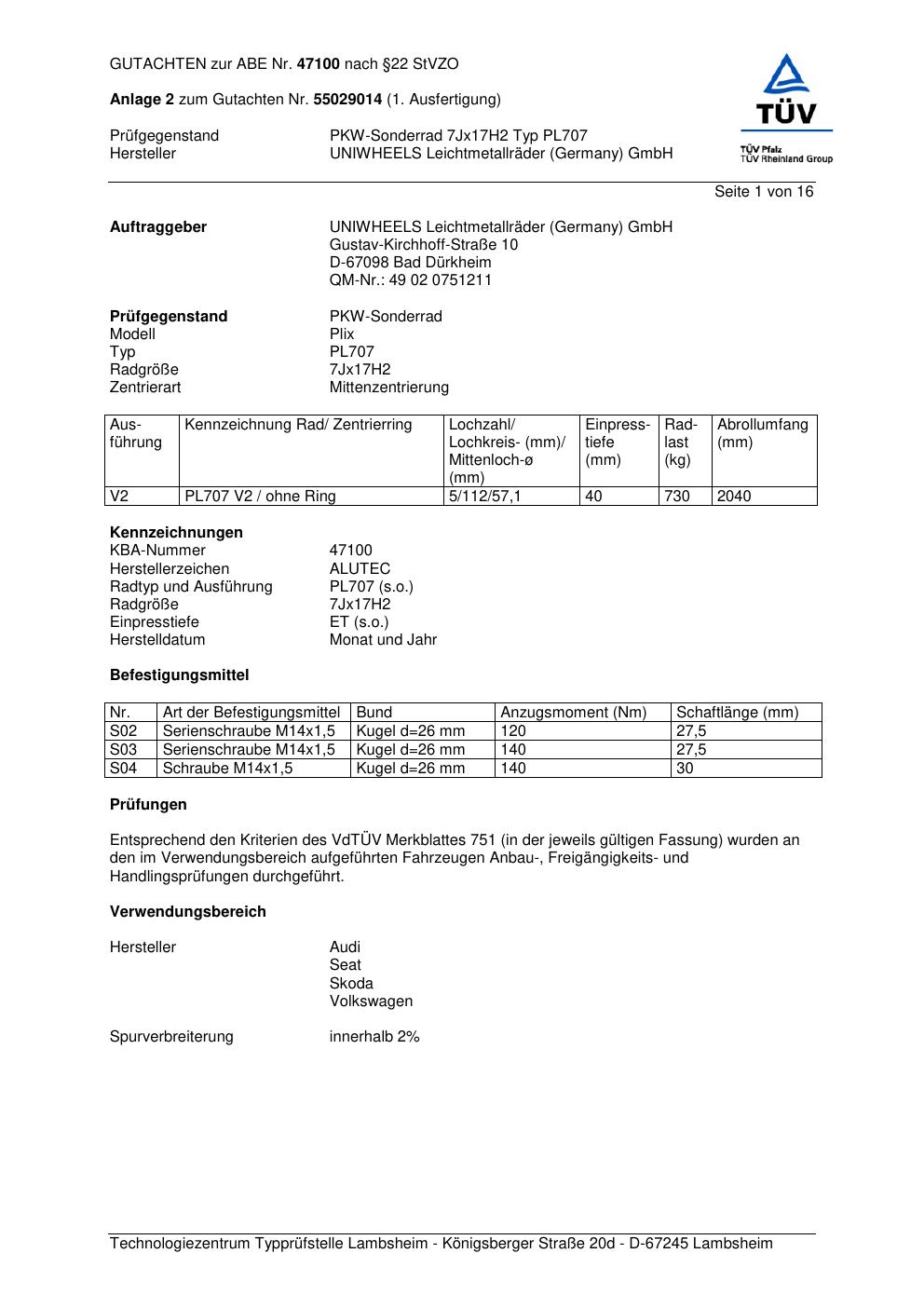 Dieses Gutachten (abe) bezieht sich auf die Alufelge ALUTEC PL707 in der Ausführung 7Jx17 ET 0, Mittenloch 0 mm (KBA 47100). Im PDF findest du typischerweise zulässige Reifengrößen, Auflagen/Anbauhinweise und – je nach Dokument – Hinweise zur Eintragung.