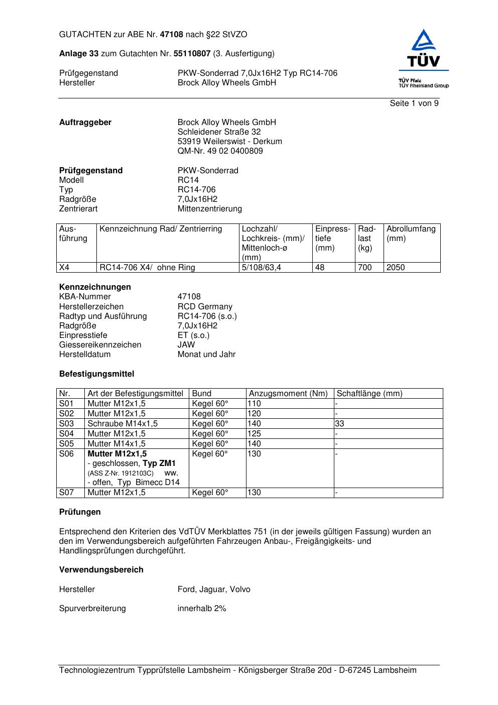Dieses Gutachten (abe) bezieht sich auf die Alufelge Brock RC14-706 in der Ausführung 7Jx16 ET 0, Mittenloch 0 mm (KBA 47108). Im PDF findest du typischerweise zulässige Reifengrößen, Auflagen/Anbauhinweise und – je nach Dokument – Hinweise zur Eintragung.