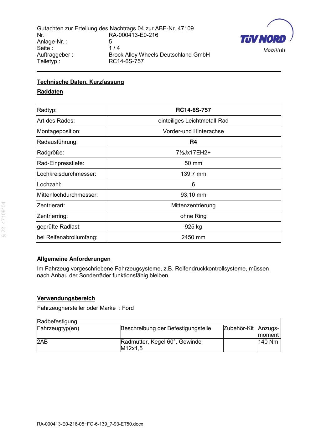Dieses Gutachten (abe) bezieht sich auf die Alufelge Brock RC14 -6S-757 in der Ausführung ET 0, Mittenloch 0 mm (KBA 47109). Im PDF findest du typischerweise zulässige Reifengrößen, Auflagen/Anbauhinweise und – je nach Dokument – Hinweise zur Eintragung.