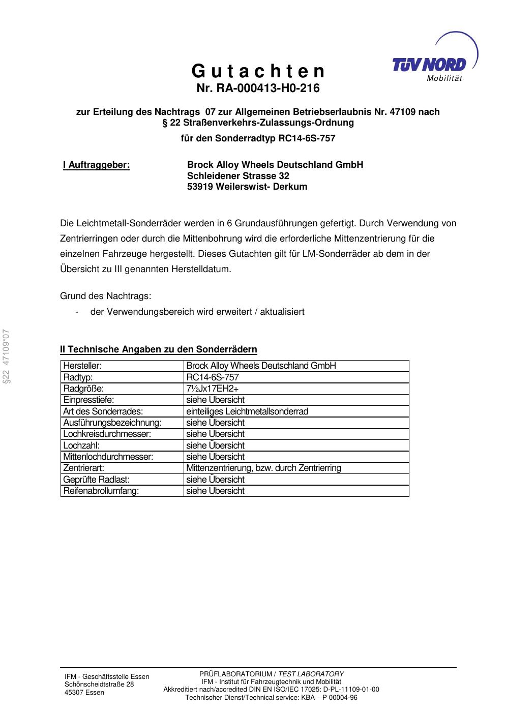 Dieses Gutachten (abe) bezieht sich auf die Alufelge Brock RC14 -6S-757 in der Ausführung ET 0, Mittenloch 0 mm (KBA 47109). Im PDF findest du typischerweise zulässige Reifengrößen, Auflagen/Anbauhinweise und – je nach Dokument – Hinweise zur Eintragung.